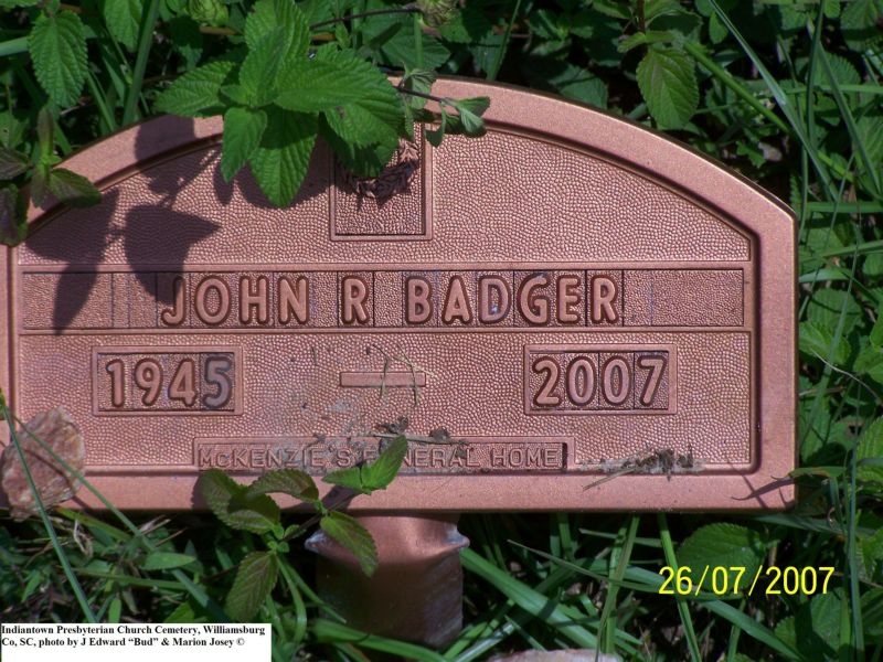 Badger, John R, Indiantown Presbyterian Church Cemetery, Williamsburg Co, SC 599.jpg