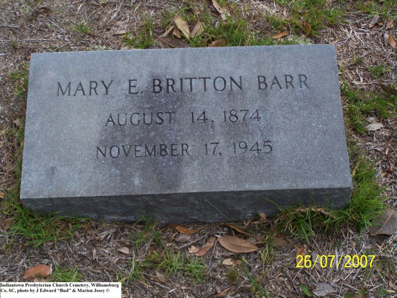 Barr, Mary E Britton, Indiantown Presbyterian Church Cemetery, Williamsburg Co, SC 218.jpg