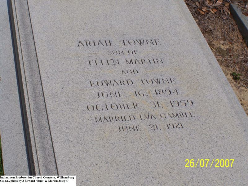 Towne, Ariail, Indiantown Presbyterian Church Cemetery, Williamsburg Co, SC 014.jpg