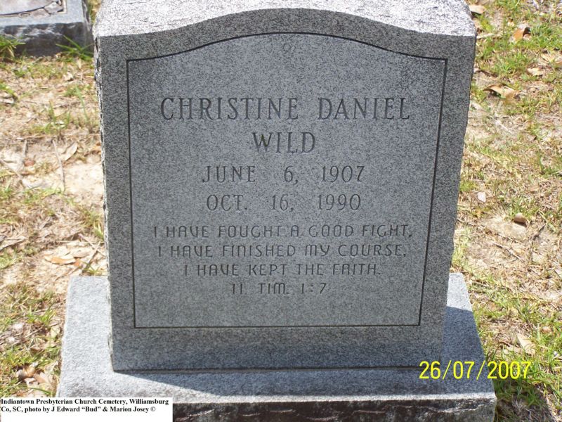 Wild, Christine Daniel, Indiantown Presbyterian Church Cemetery, Williamsburg Co, SC 524.jpg