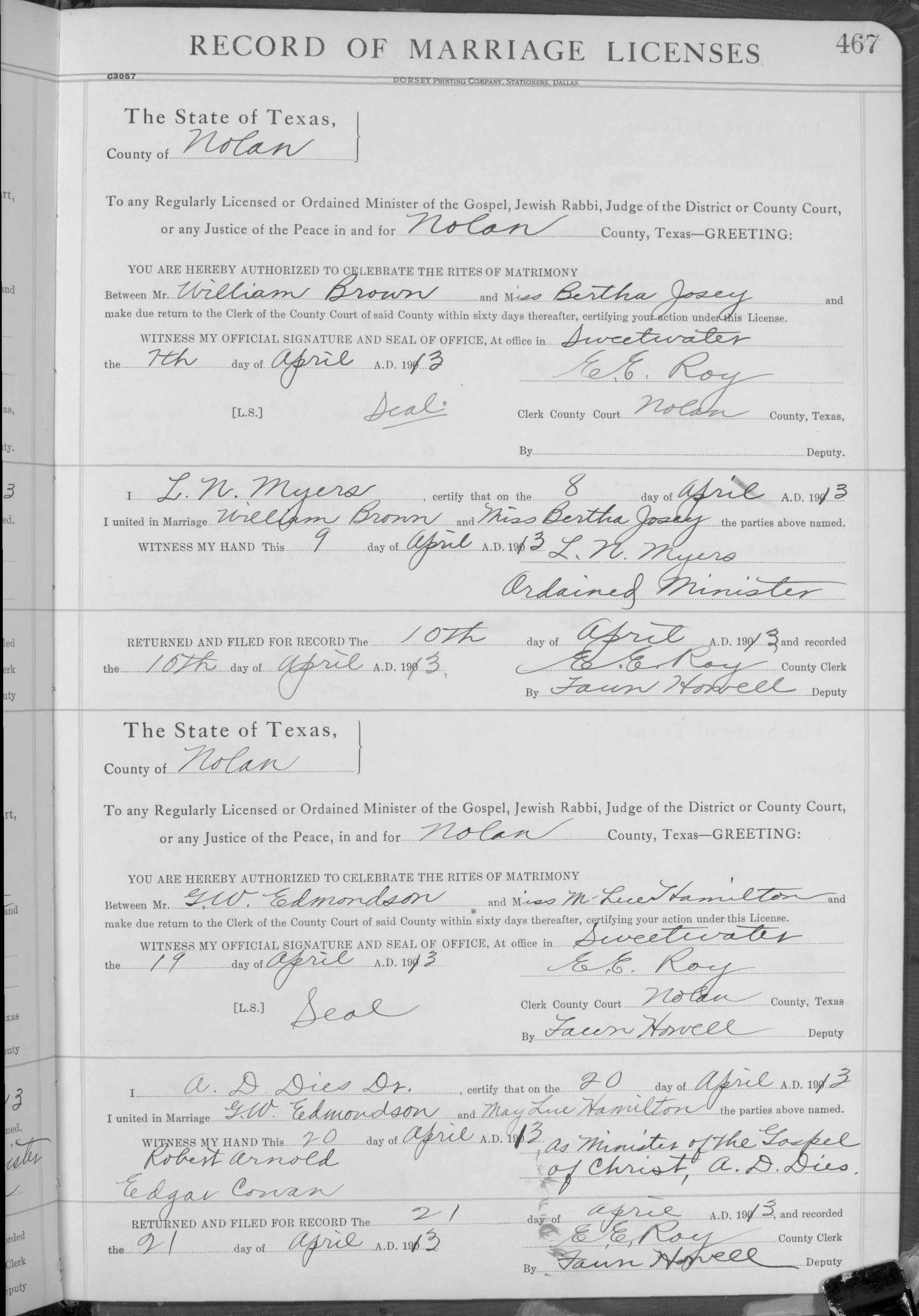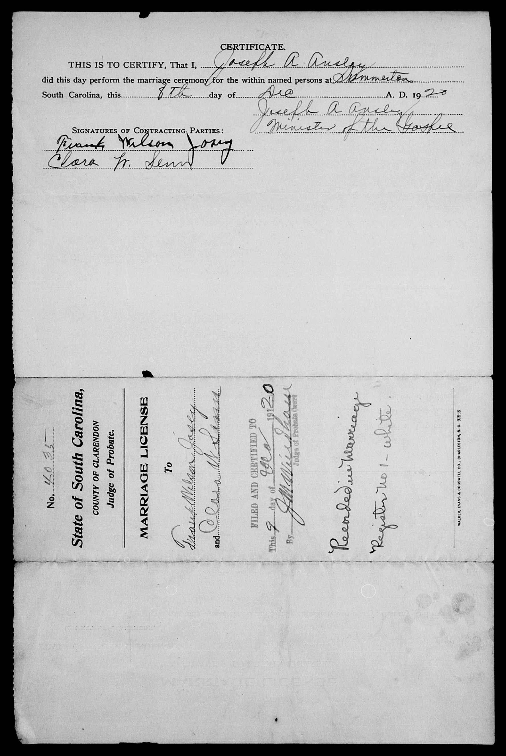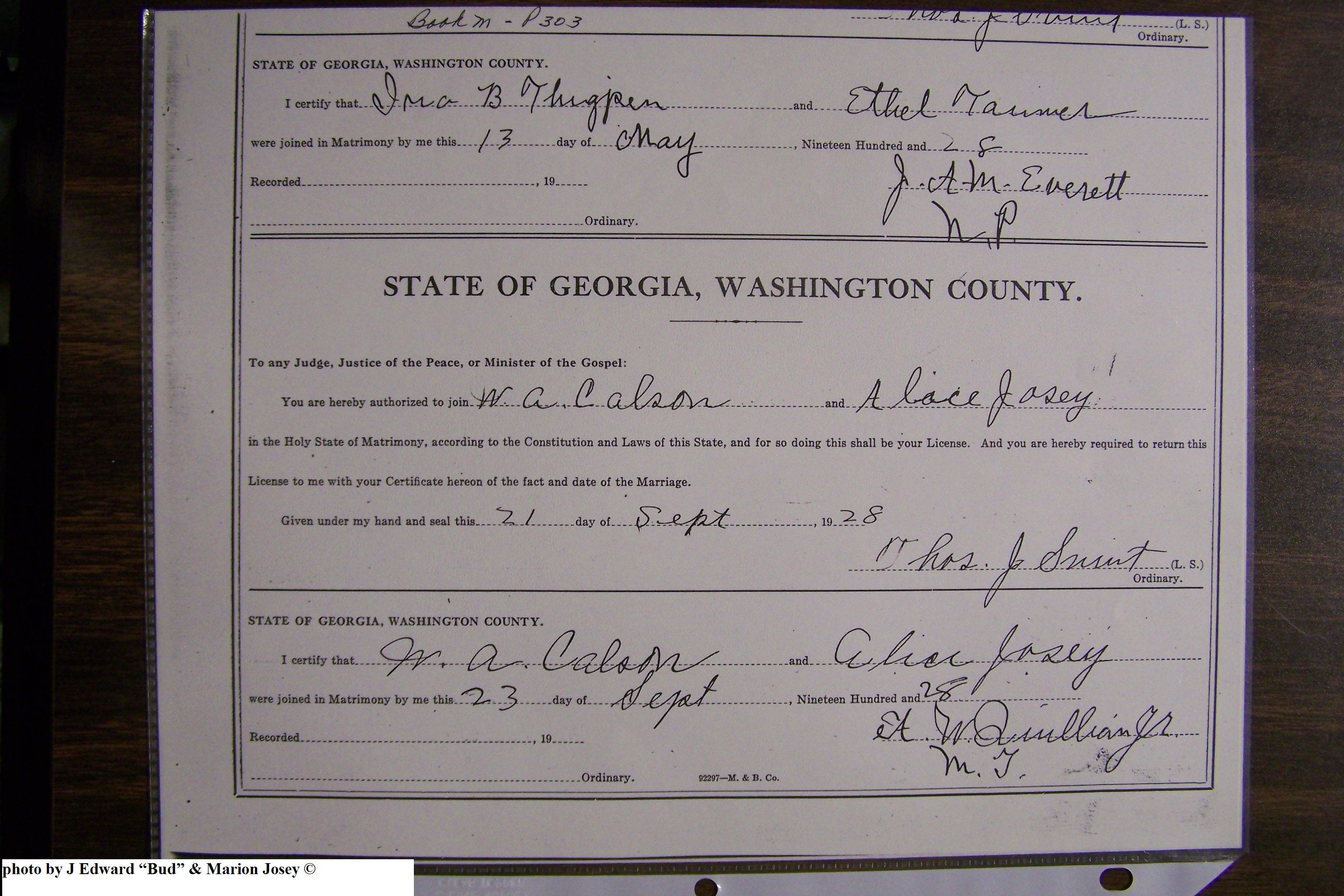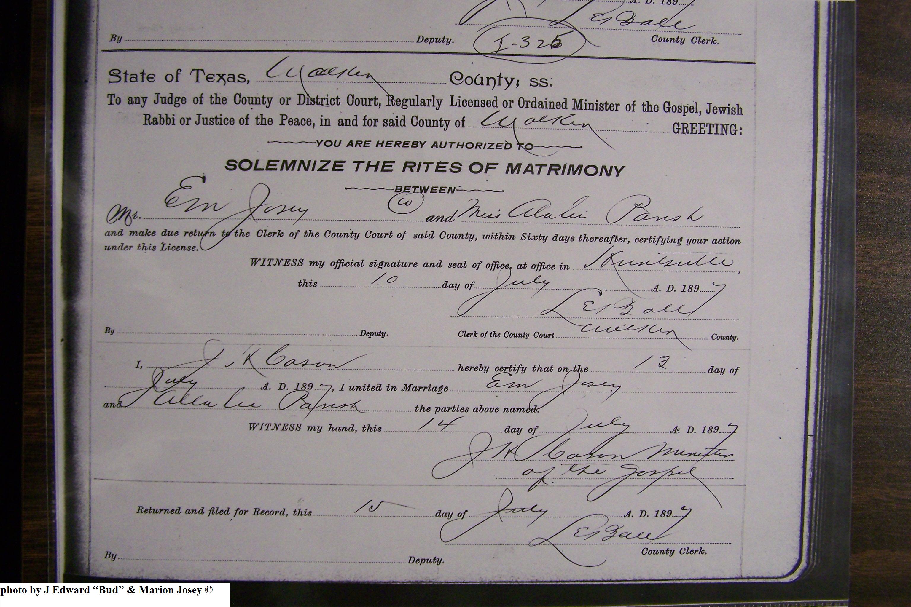 Josey, Alice & W A Colson, Marriage Lic 167.JPG