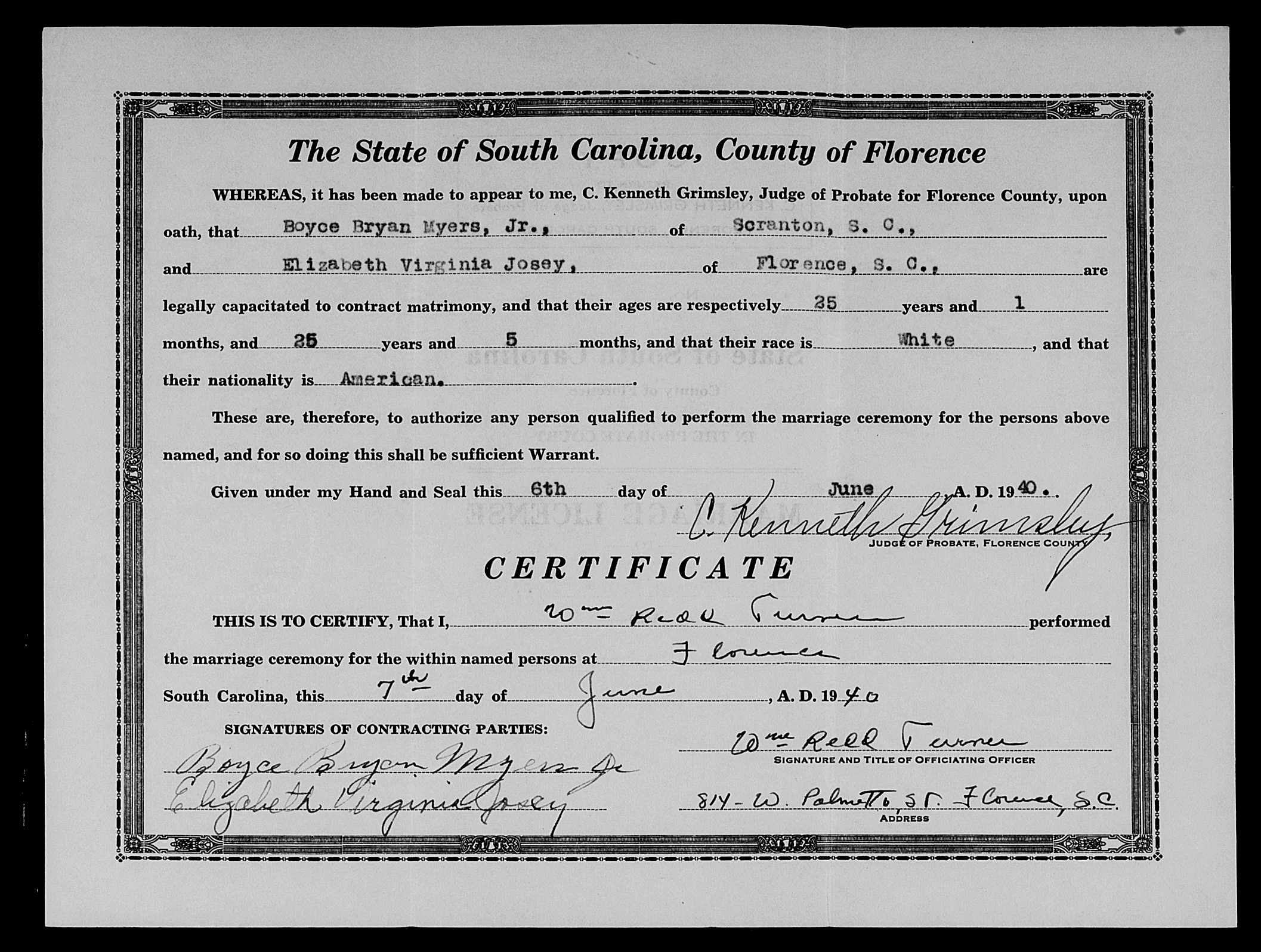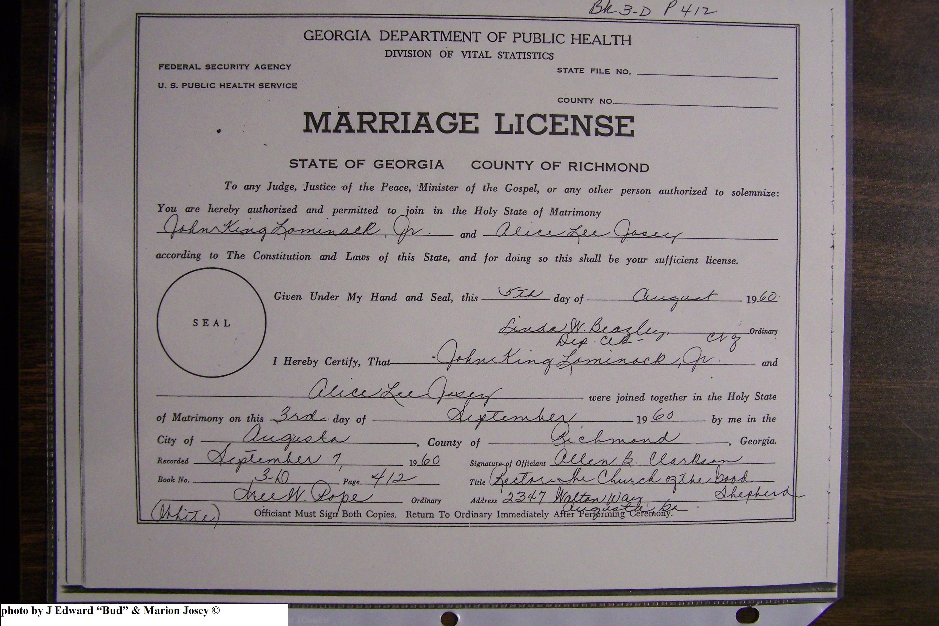 Josey, Alice Lee & John King Lominack Jr, Marriage Lic 095.JPG