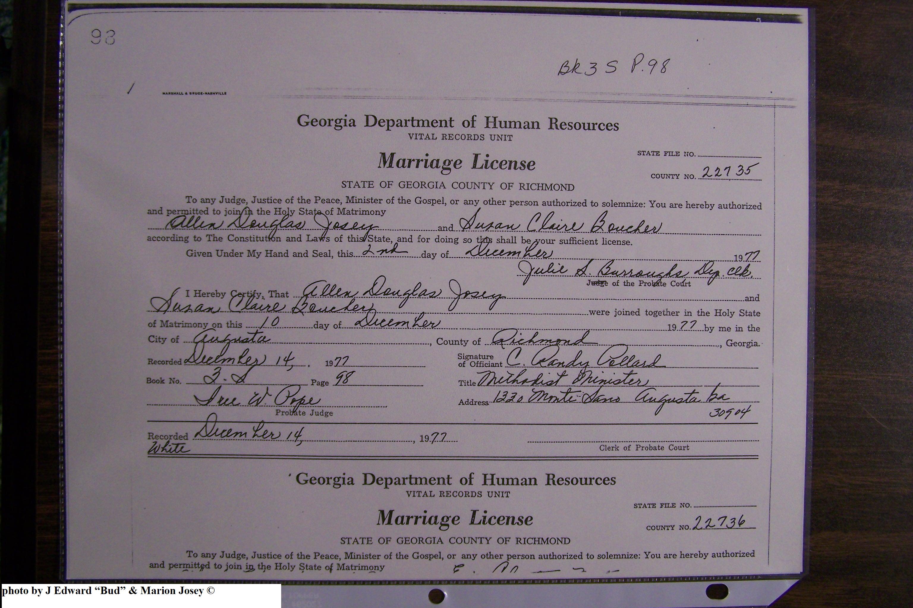 Josey, Allen Douglas & Susan Claire Boucher, Marriage Lic 107.JPG