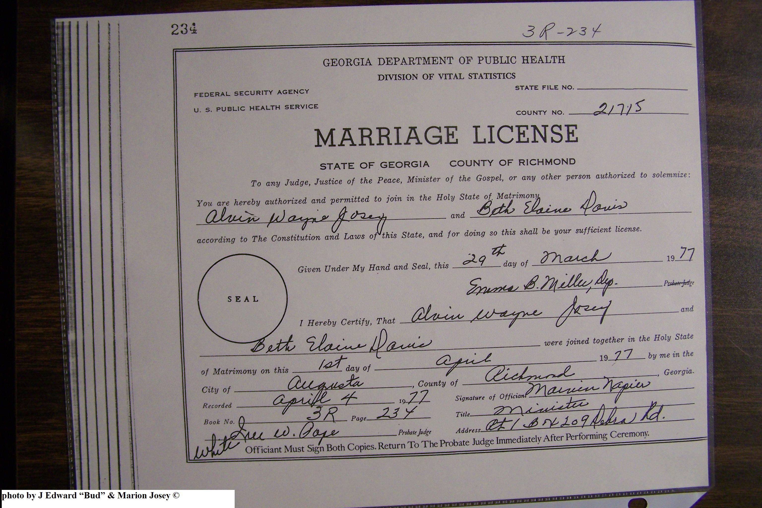 Josey, Alvin Wayne & Beth Elaine Davis, Marriage Lic 105.JPG