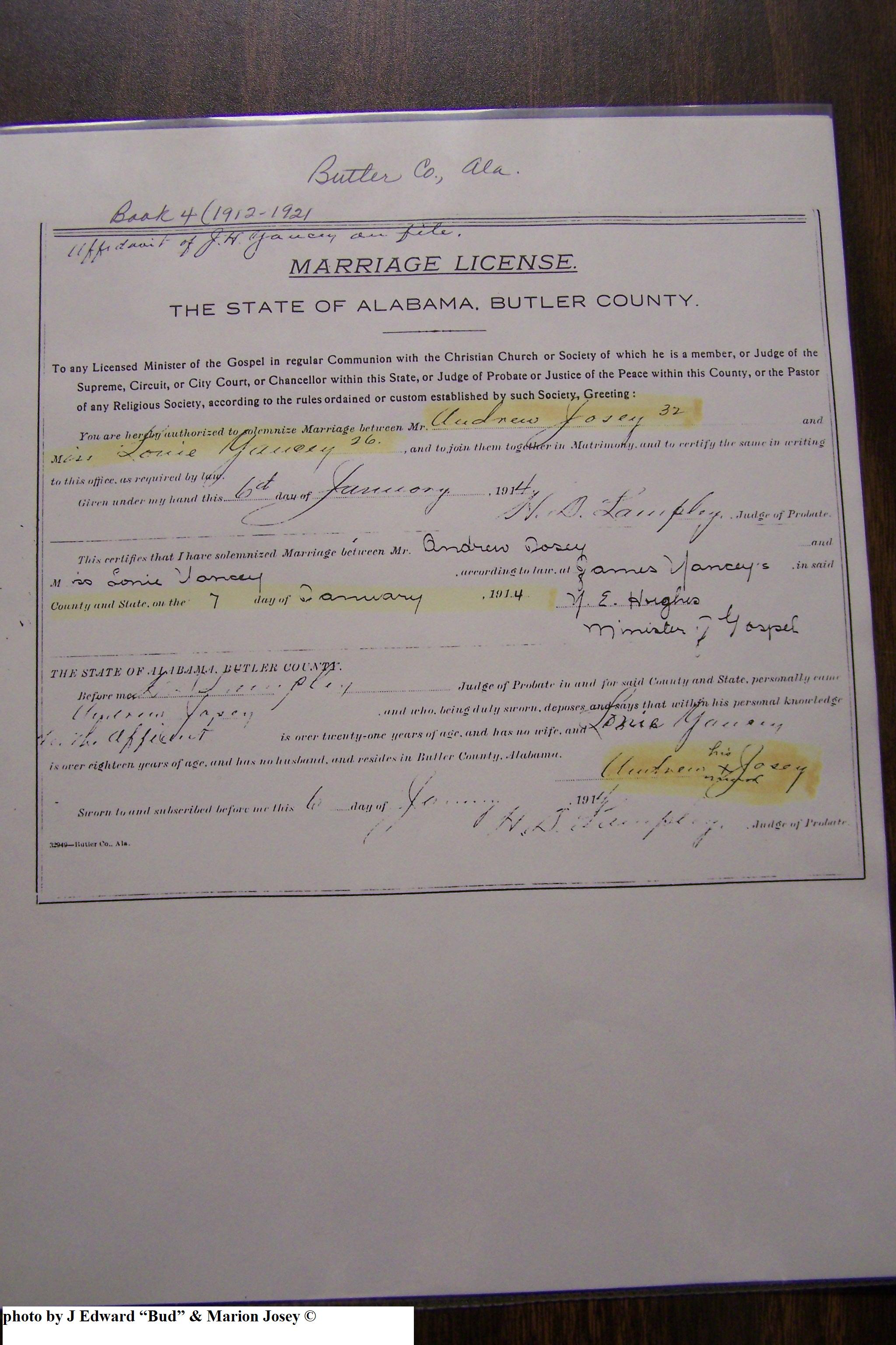 Josey, Andrew Jackson & Mittie Lonnie Yancey, Marriage Lic 023.JPG