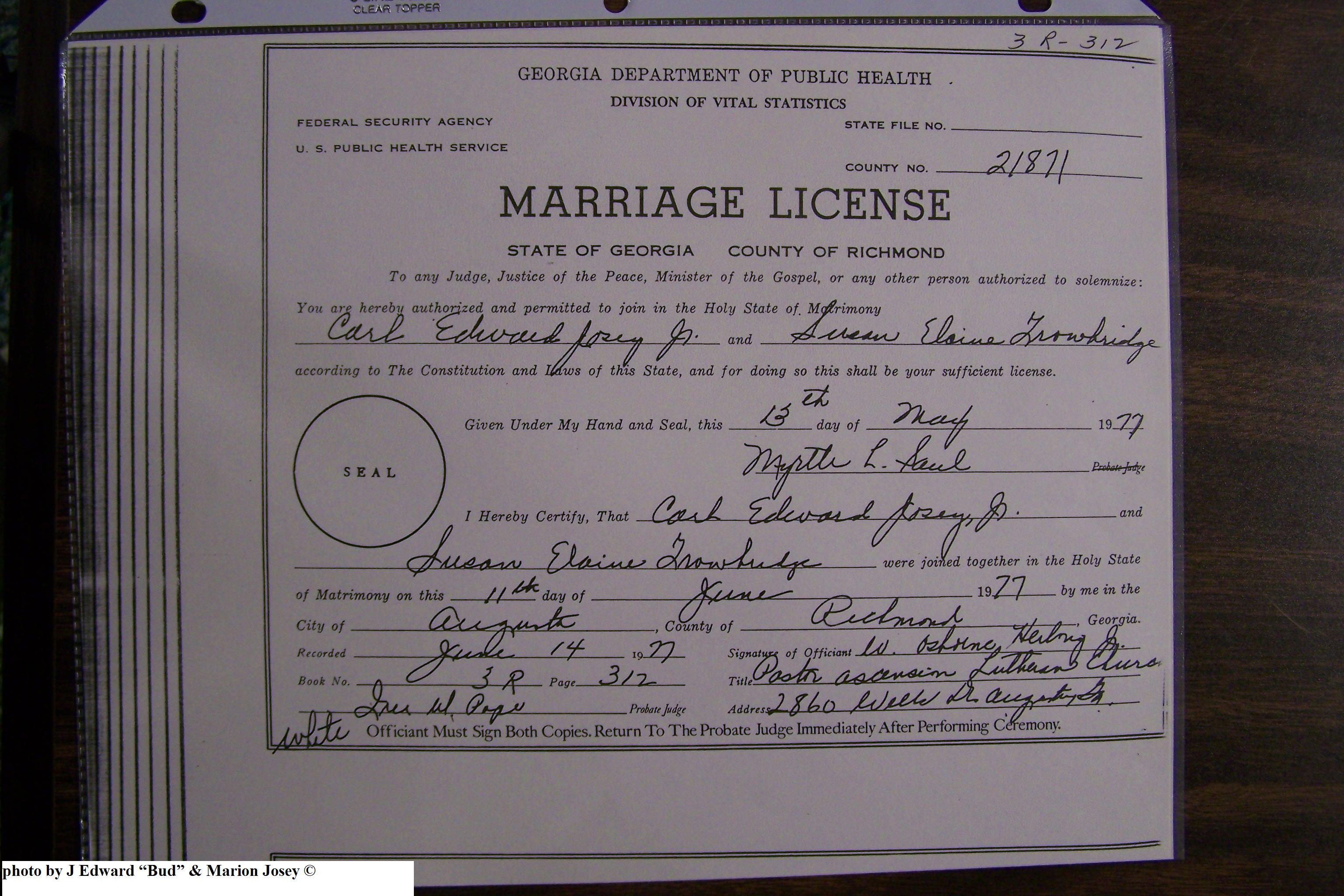 Josey, Carl Edward & Susan Elaine Trowbridge, Marriage Lic 106.JPG