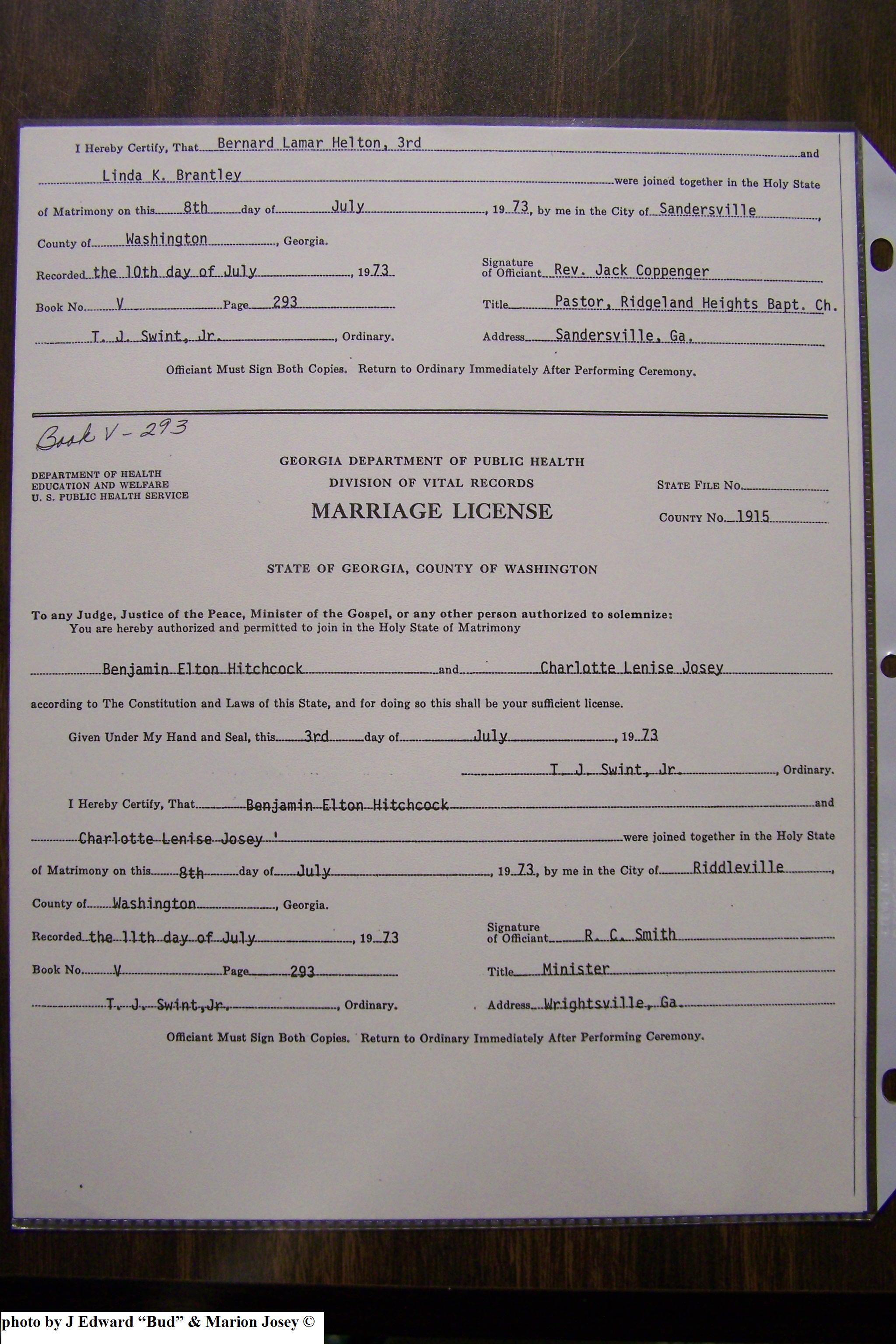 Josey, Charlotte Lenise & Benjamin Elton Hitchock, Marriage Lic 195.JPG