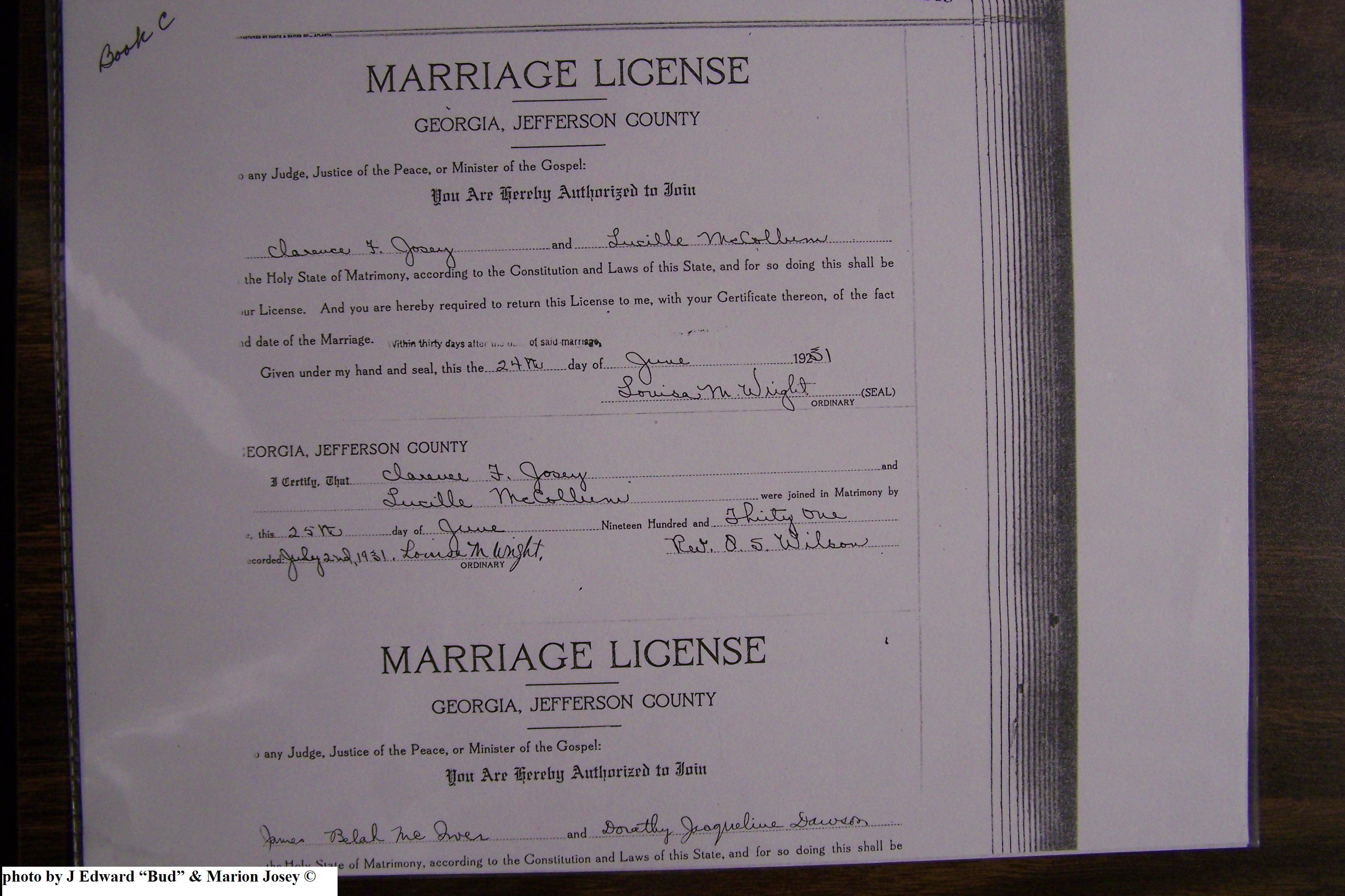Josey, Clarence Frederick & Lucille McCollum, Marriage Lic 077.JPG