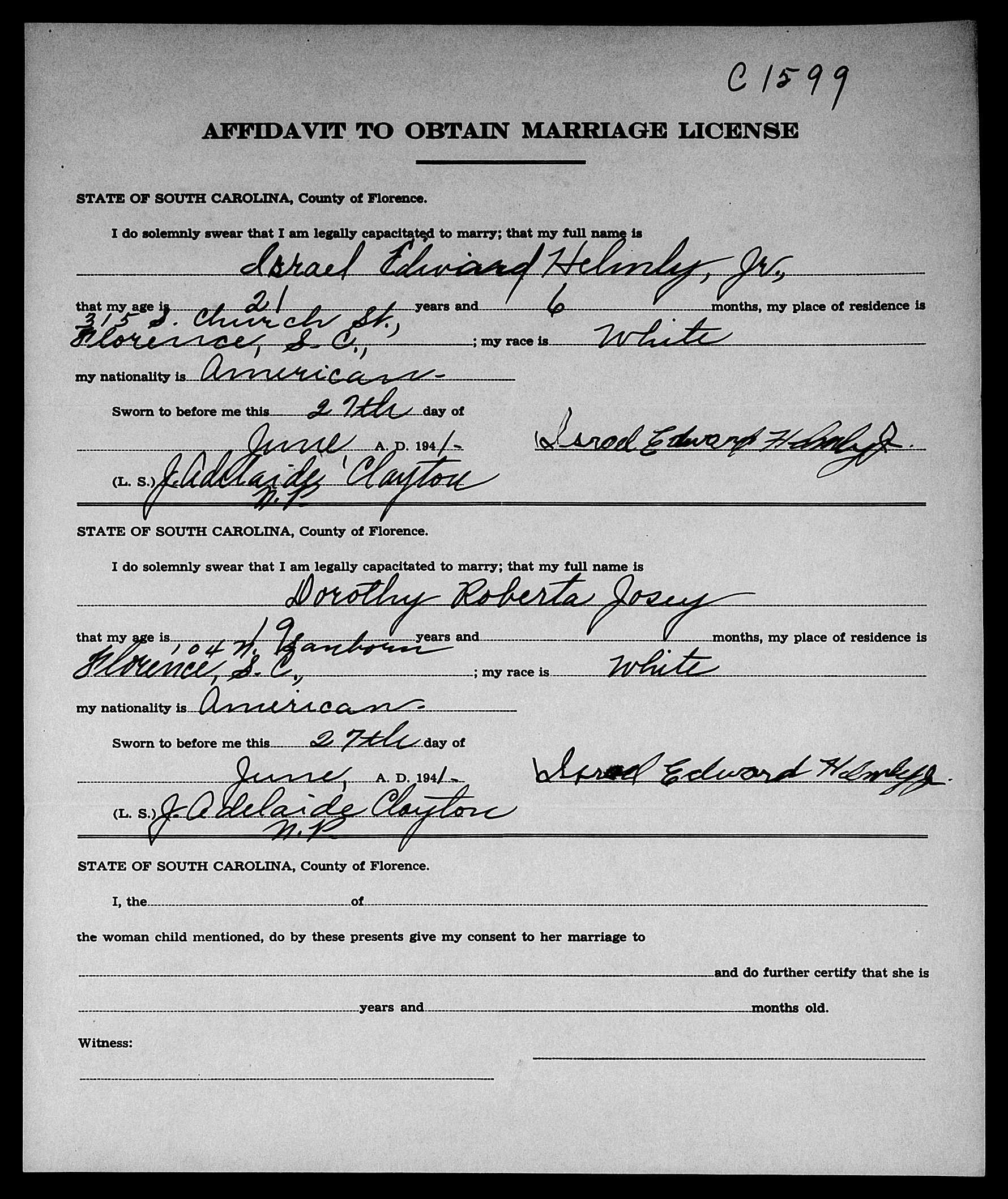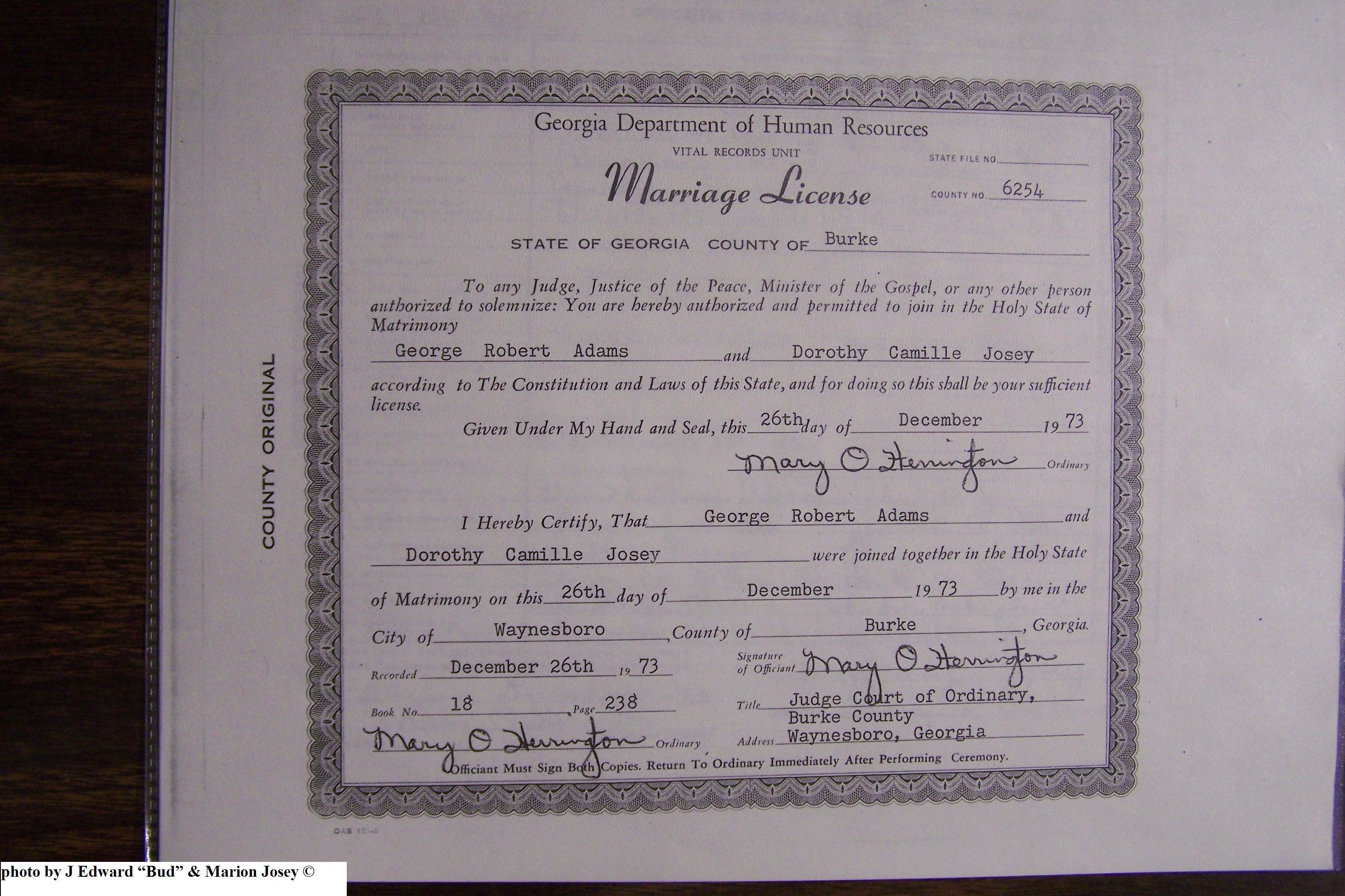 Josey, Dorothy Camille & George Robert Adams, Marriage Lic 037.JPG