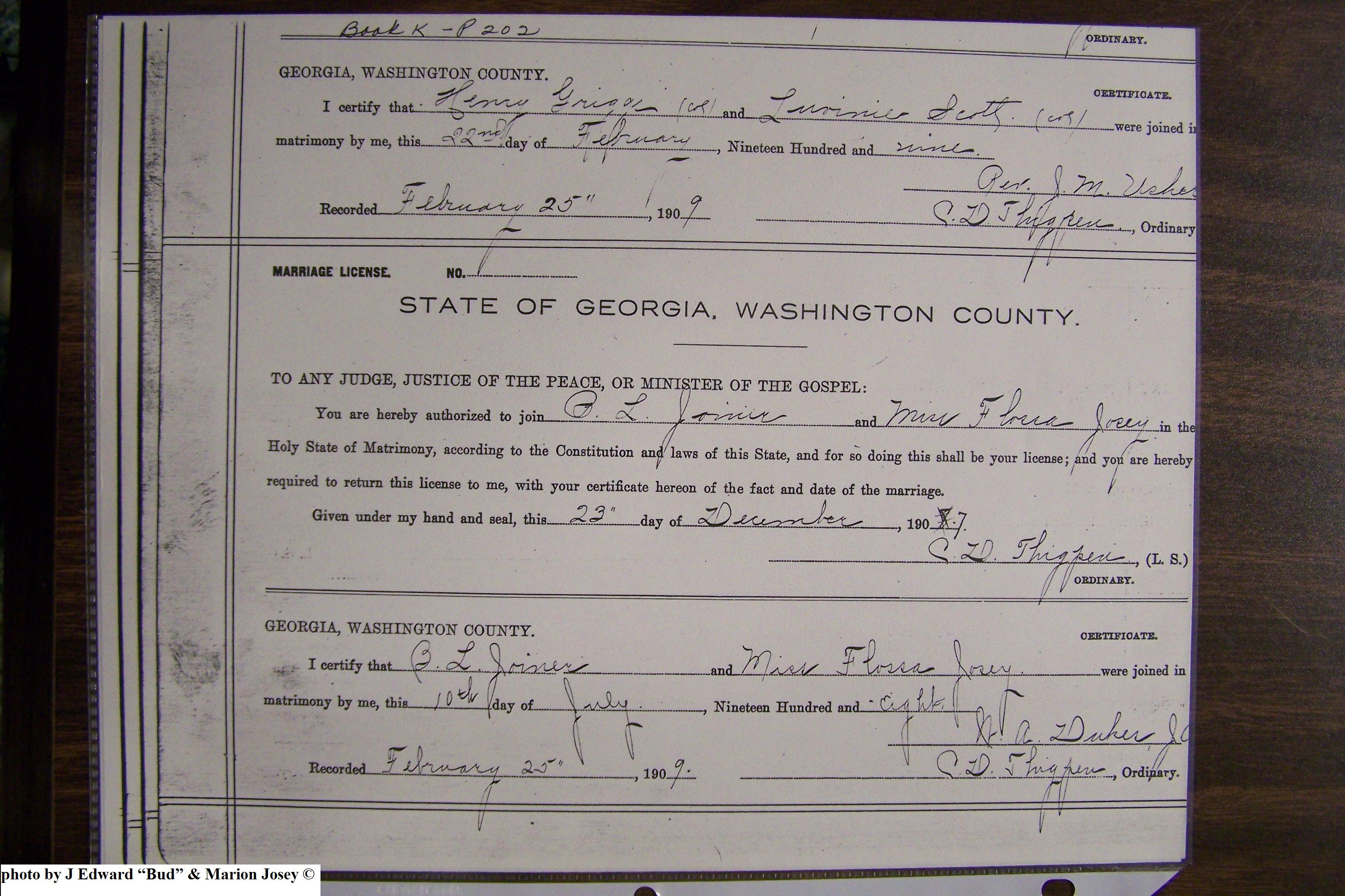 Josey, Flossa & B L Joiner, Marriage Lic 149.JPG