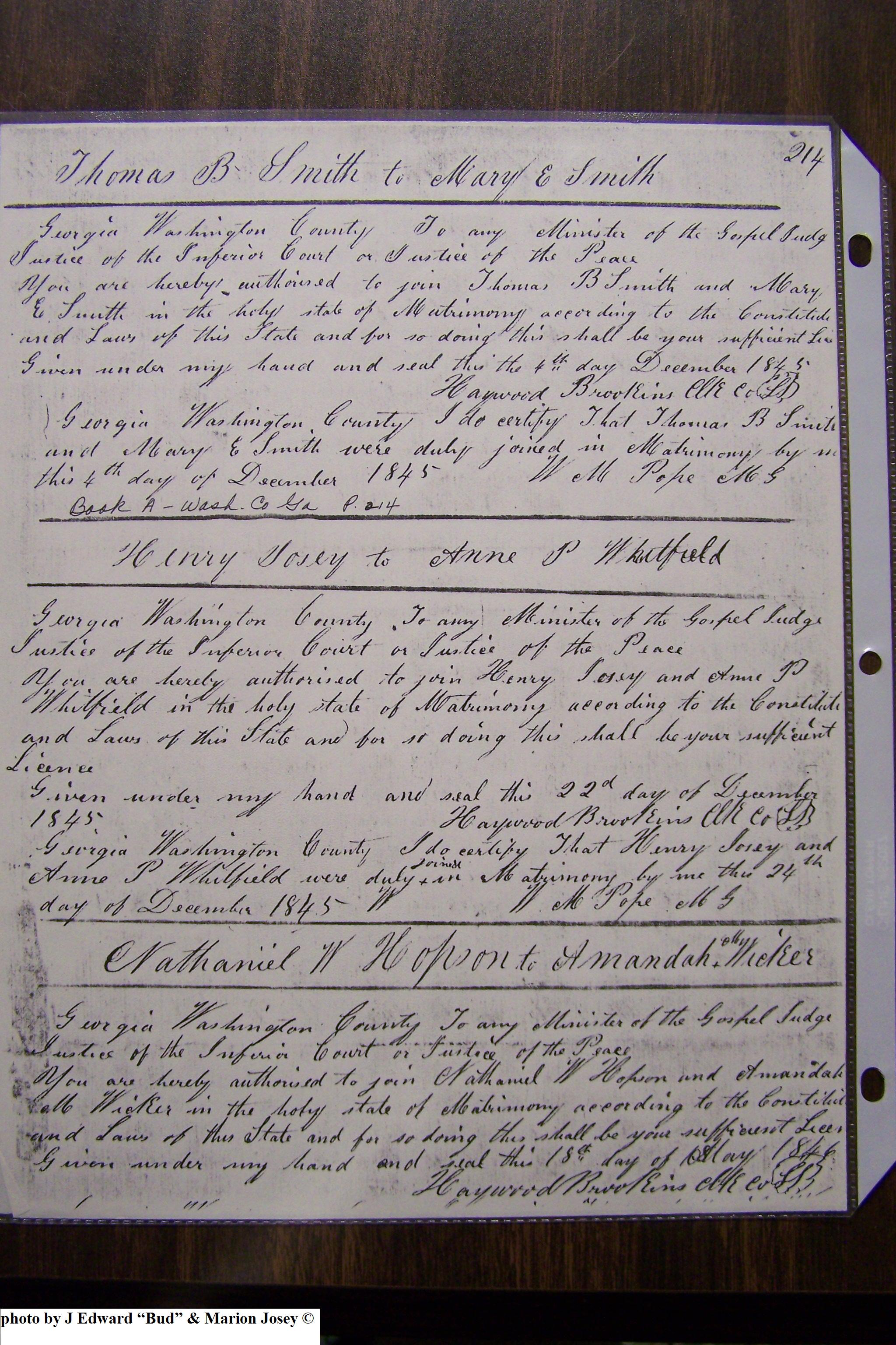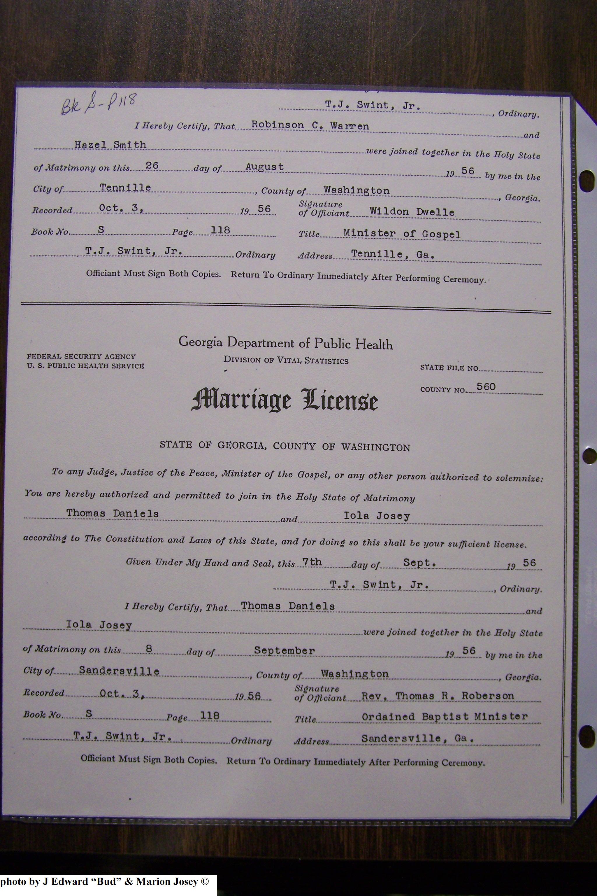 Josey Marriage Lic Washington Co, GA, pg 3, 118.JPG
