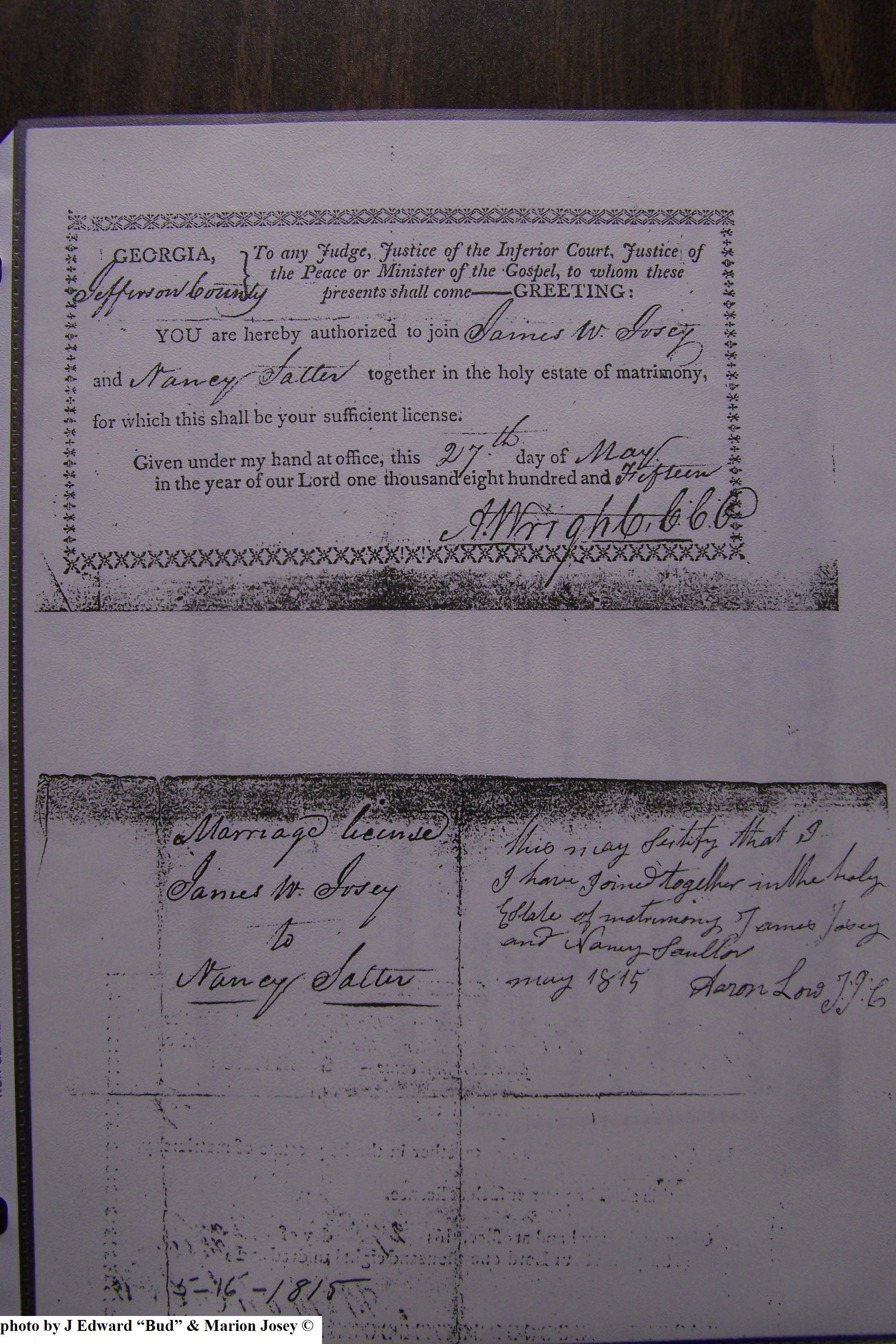 Josey Marriage Lic Washington Co, GA, pg 1, 116.JPG