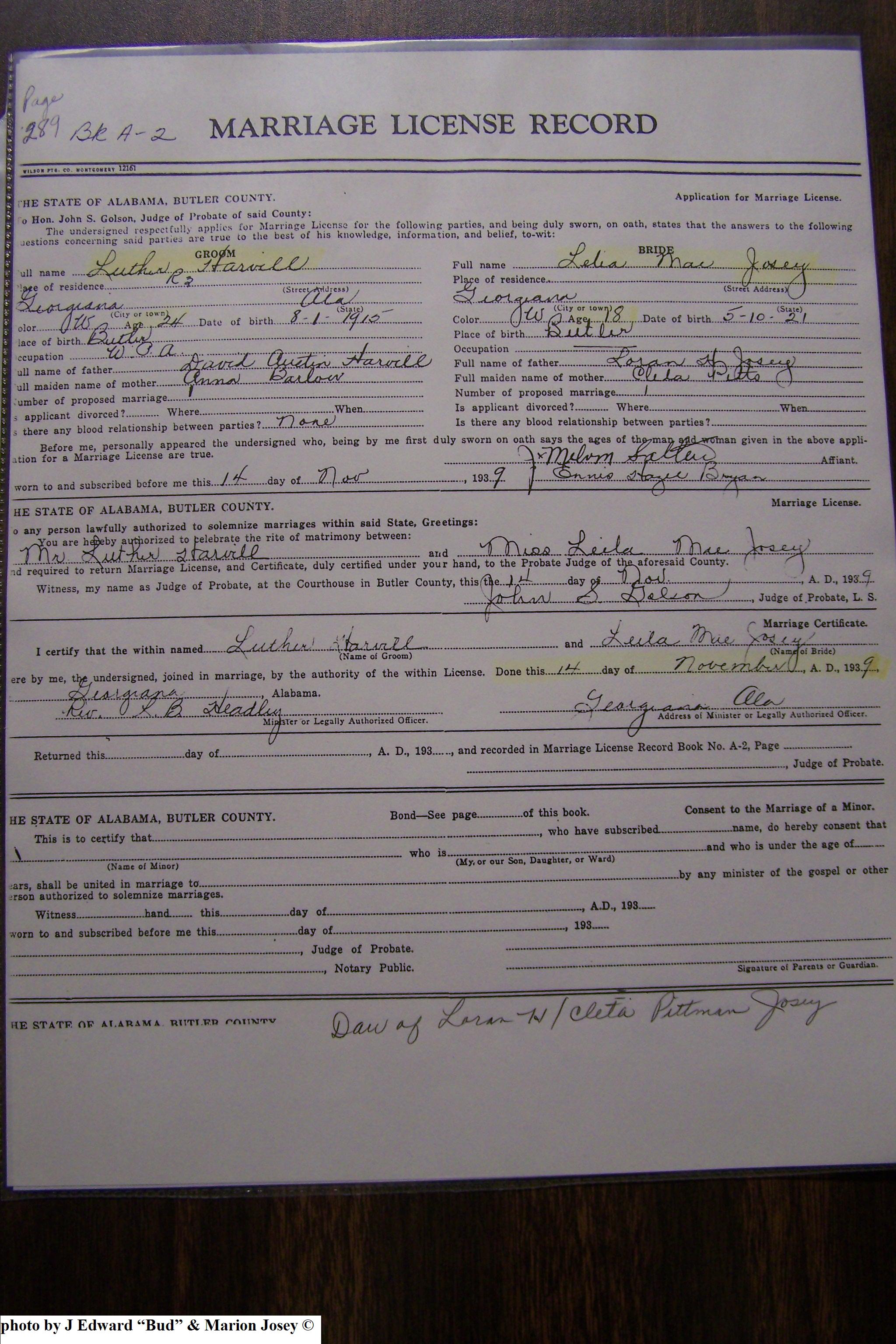 Josey, William Thomas & Vonnie Lee Etheridge, Marriage Lic 160.JPG