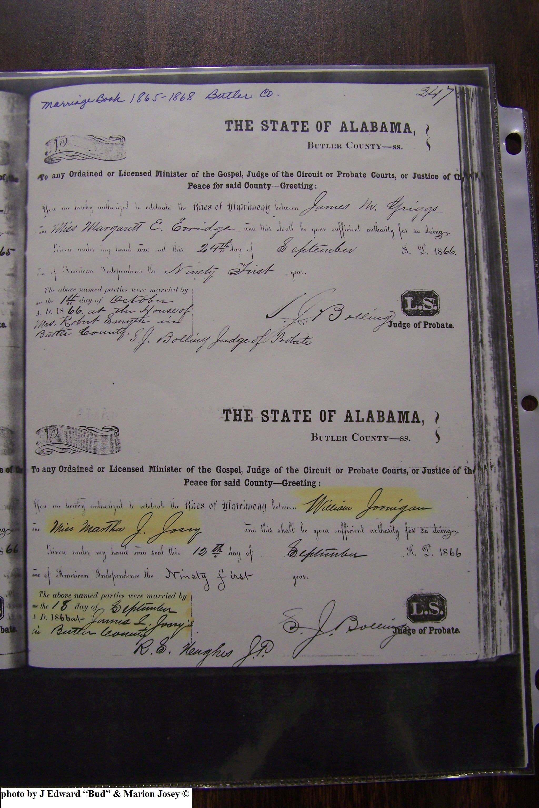 Josey, Thomas Jefferson & Emily Frances Jernigan, Marriage Lic 015.JPG